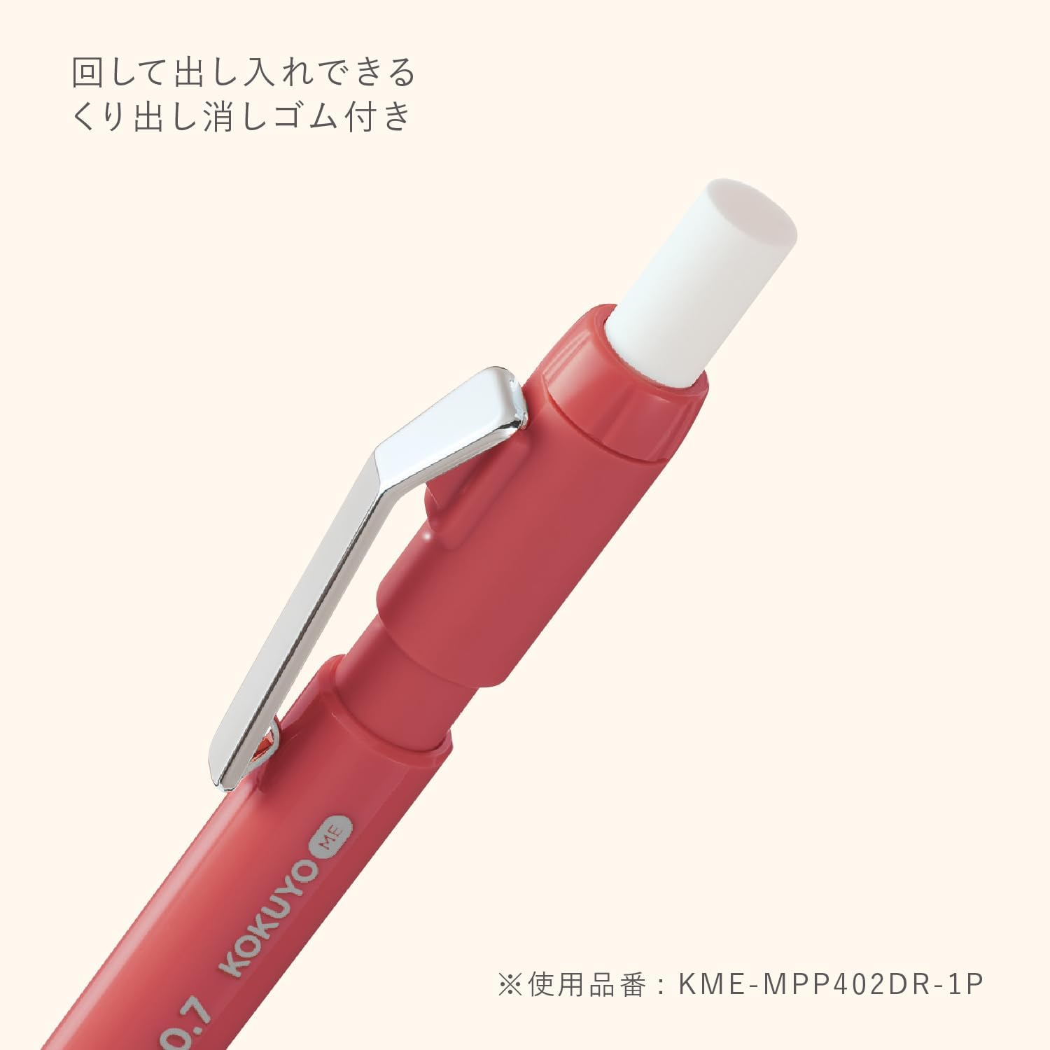 This is a mechanical pencil from the KOKUYO ME series. The thick lead allows smooth, pencil-like writing and resists breakage. Includes a durable metal clip that holds securely and allows easy carrying on pockets or notebooks. The non-slip rubber grip fits comfortably in the fingers. The front section is hexagonal for a firm hold, while the rear is rounded for relaxed gripping. The slim metal tip improves visibility when writing and provides stable performance. The pipe tip is retractable for safety.
