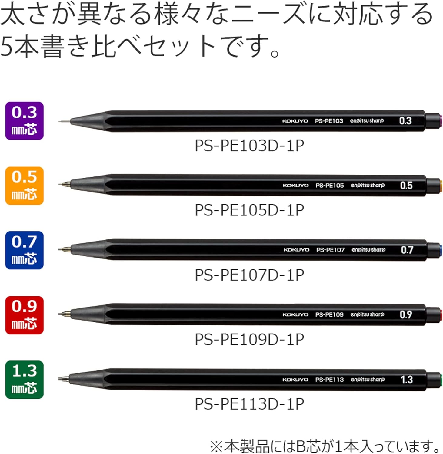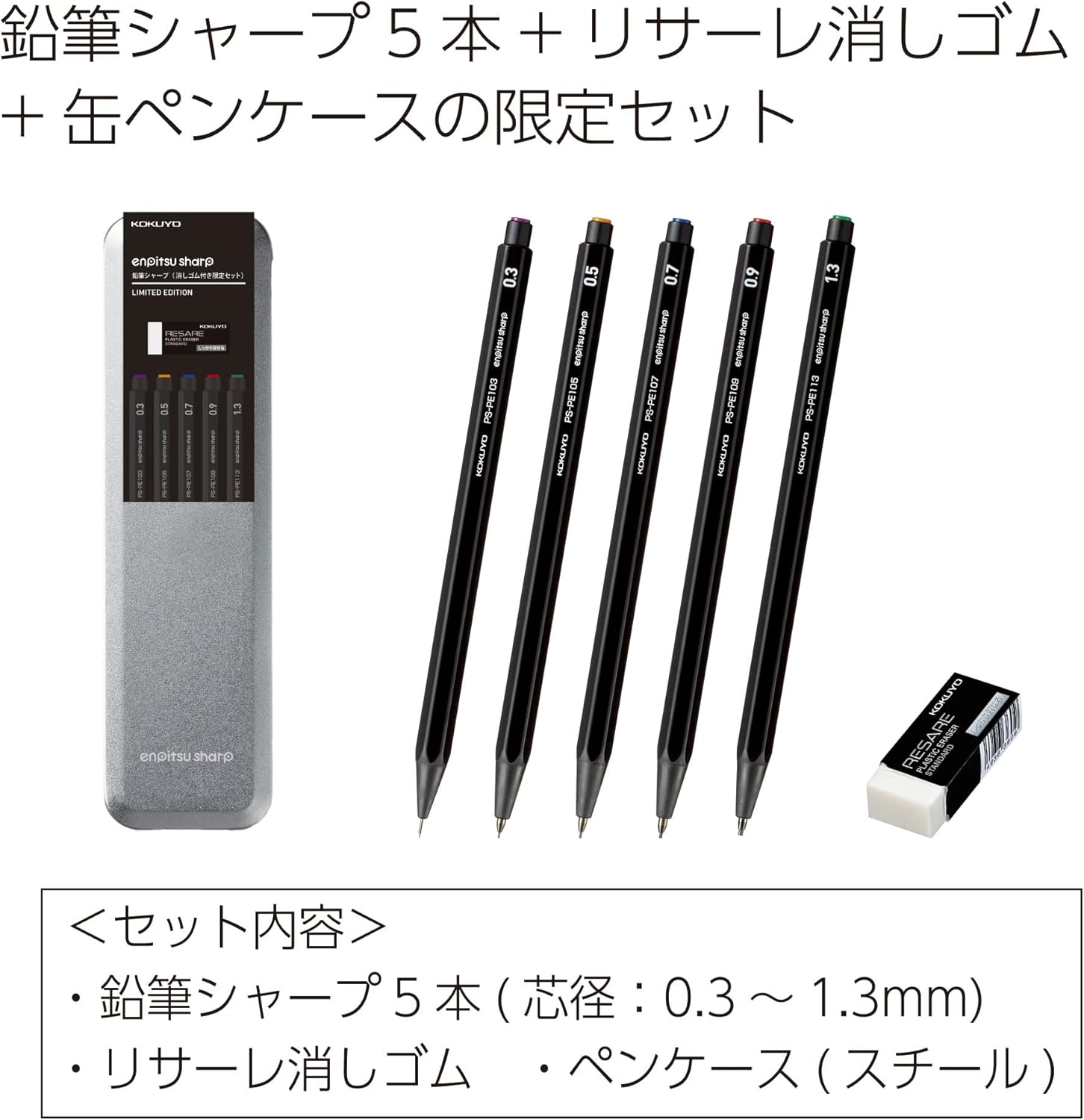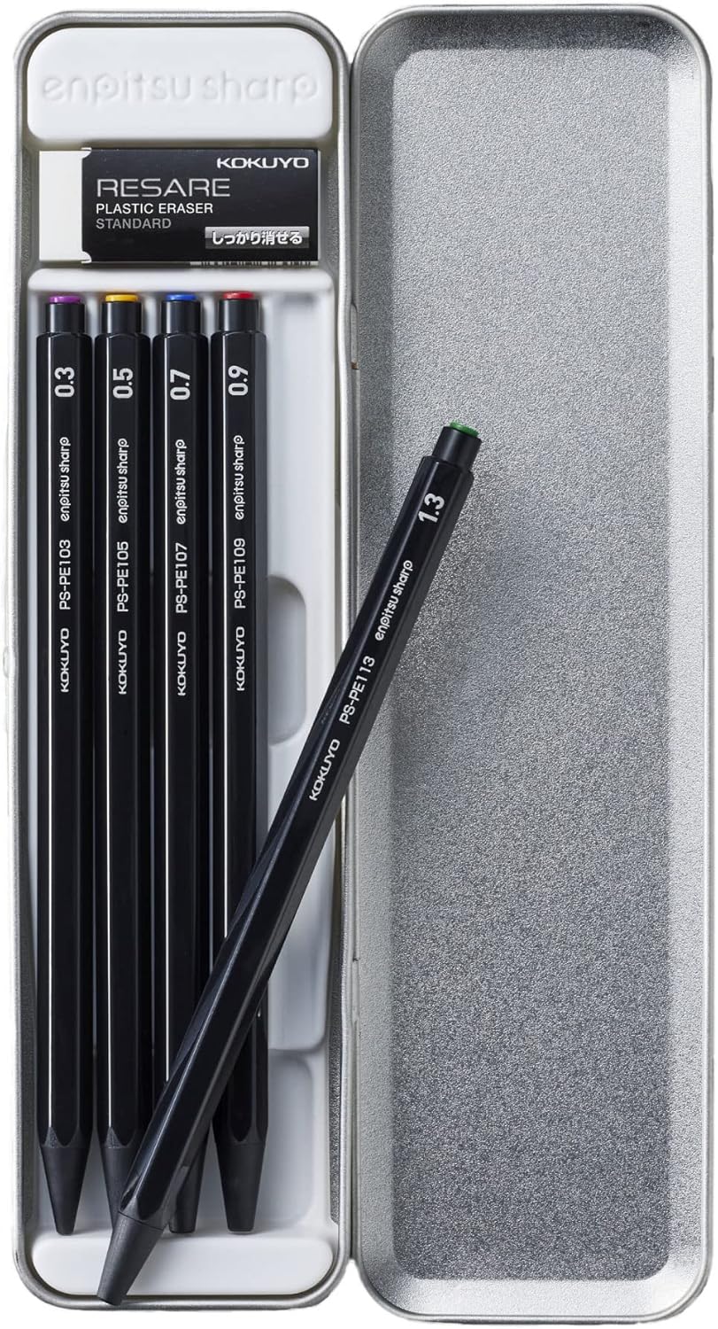 Set contents: Mechanical pencils (5 pcs), Resare eraser (model KESHI-1N), pen case (steel). Color: Black. Lead sizes: 0.3 mm (PS-PE103D), 0.5 mm (PS-PE105D), 0.7 mm (PS-PE107D), 0.9 mm (PS-PE109D), 1.3 mm (PS-PE113D). Outer dimensions: 57 mm x 16 mm x 205 mm. Materials: Mechanical pencil PC, Resare PVC.