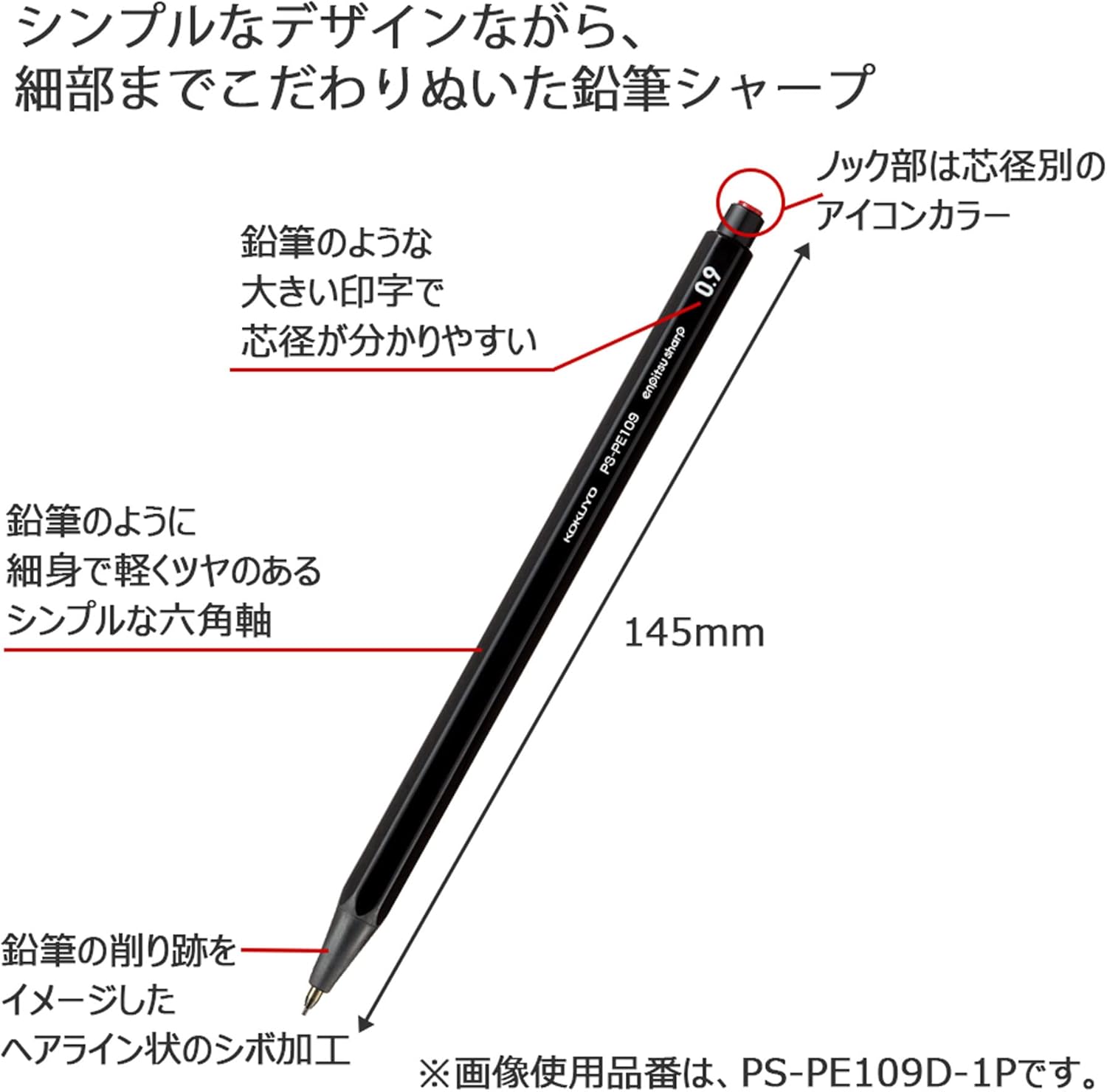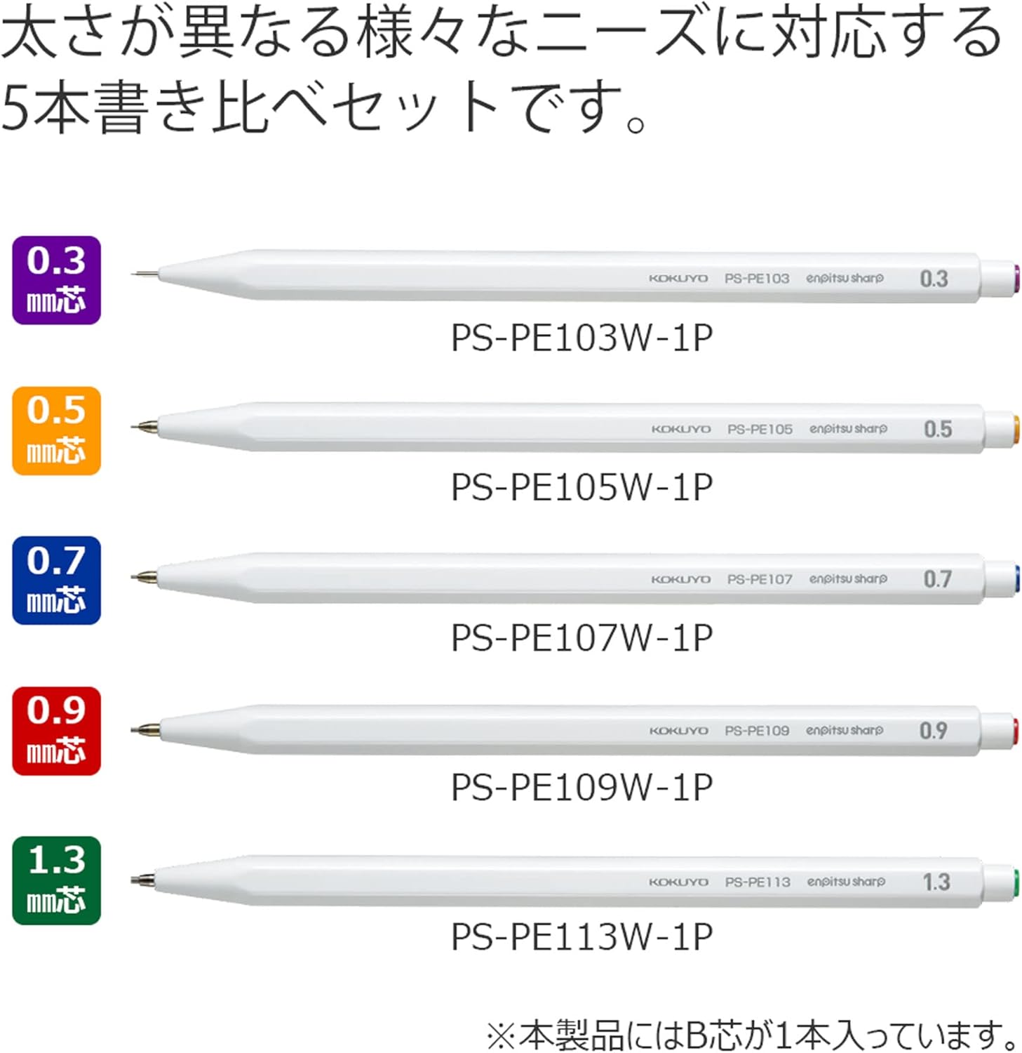 Pencil-like line variation is expressed with 5 lead sizes: 0.3 mm, 0.5 mm, 0.7 mm, 0.9 mm, and 1.3 mm.