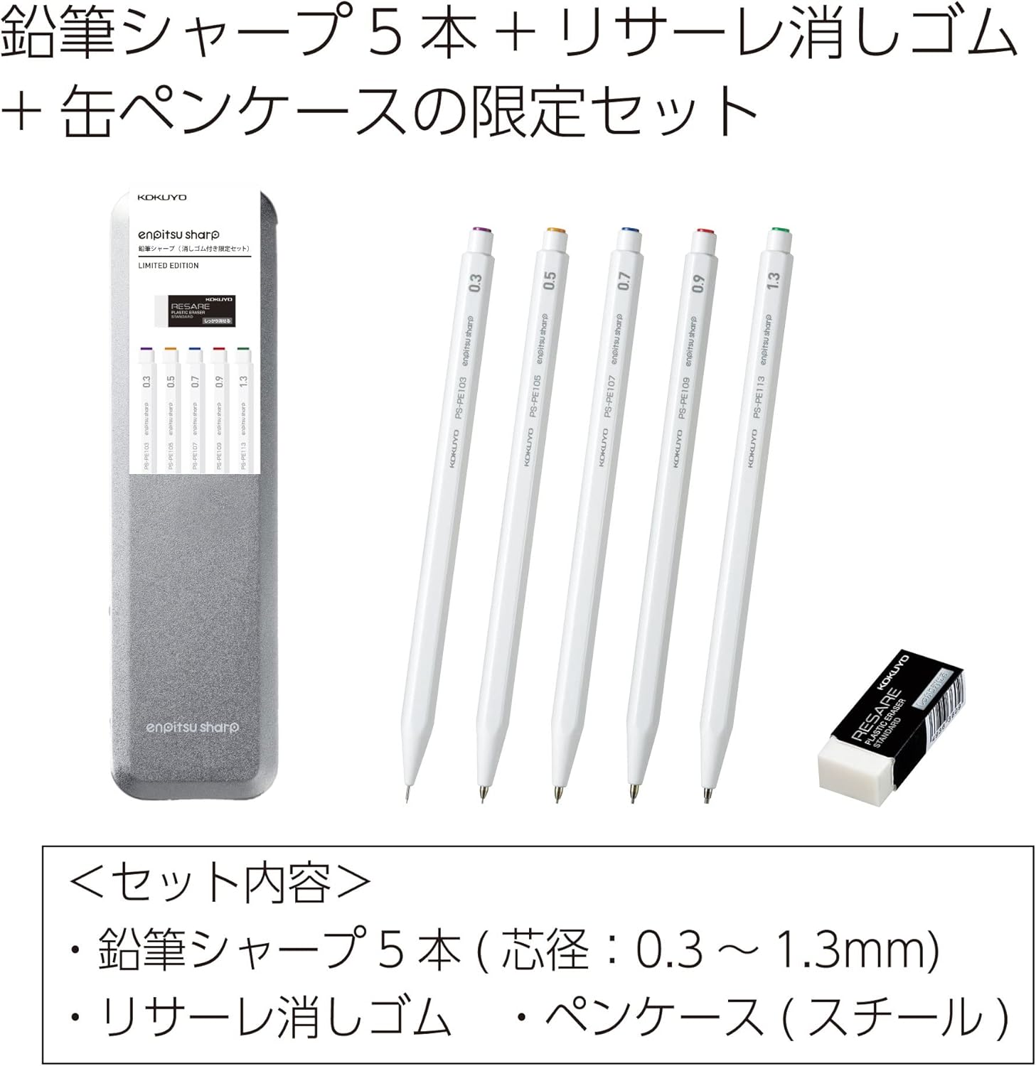 Set contents: Mechanical pencils (5 pcs), Resare eraser (model KESHI-1N), pen case (steel). Color: White. Lead sizes: 0.3 mm (PS-PE103W), 0.5 mm (PS-PE105W), 0.7 mm (PS-PE107W), 0.9 mm (PS-PE109W), 1.3 mm (PS-PE113W). Outer dimensions: 57 mm x 16 mm x 205 mm. Materials: Mechanical pencil PC, Resare PVC.