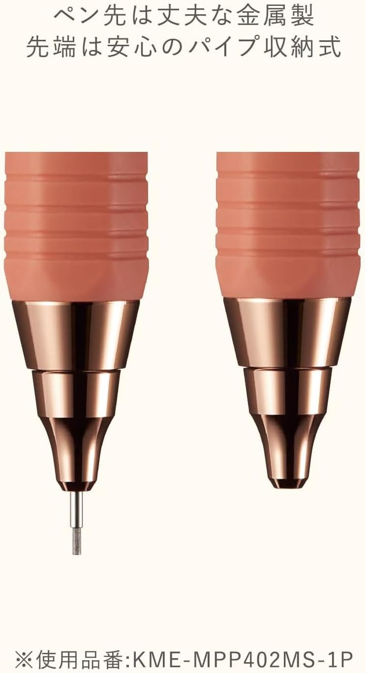 This is a mechanical pencil from the KOKUYO ME series. The thick lead writes smoothly like a pencil and is resistant to breakage. Includes a strong metal clip that holds securely and is easy to carry on pockets or notebooks. The non-slip rubber grip fits comfortably in the fingers. The front section is hexagonal for a firm hold, while the rear is rounded for relaxed grip. The slim metal tip provides clear visibility of the writing area and stable performance. The pipe tip is retractable for safety.